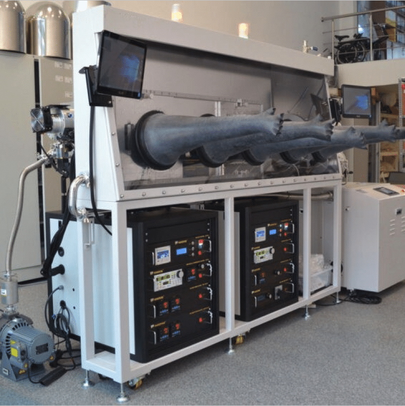 PSC Glove-Box Systems combine Glove-Box units supplied by dedicated Glove-Box specialists and PSC vacuum and electronic components. These systems can be configured with one or two vacuum chambers with hinged doors in the back and sliding doors on the Glove-Box side. There are added components such as vacuum pumps and QCM units. Systems easily pump down to 1×10-7 Torr vacuum levels. Components such as thickness monitors, sputter guns, evaporation sources and effusion cells can be added. The chambers are e-polished on the inside and outside. Systems are configured to run automatically with tailored LabVIEW programs. The Glove-Box sustains 0.1 ppm water vapor and oxygen levels with its blower and filter apparatus.